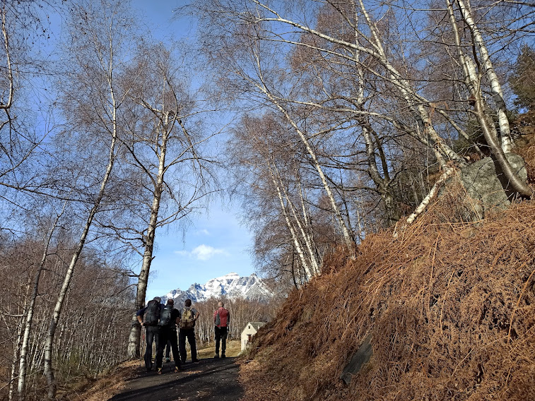 Abbassa l’età media dei cinque anziani la nostra fedele badante, unica rappresentante odierna dell’etnia verbanese. Gli altri lacustri prediligono la neve, anche quando non c’è. Il sentiero, a tratti molto ripido, scalda subito i muscoli intorpiditi dagli ozi natalizi e, in meno di mezz’ora, ci porta a Veglio, 540.