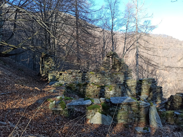 E’ il punto più alto dell’escursione, quota 1917. Dal Colle del Pianino un’ora e un quarto. Anche qui torna ad essere indispensabile la presenza di chi conosce il territorio, perché il sentiero che scende verso nord est non è indicato né segnato e non esiste più sulle cartine. Il pendio è molto ripido e, osservando la gara di tuffi nei “bosciul” che alcuni amici organizzano davanti a me, inserisco le ridotte e scendo con grande prudenza fino ai ruderi dell’Alpe Forno, 1757.