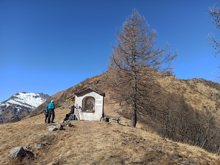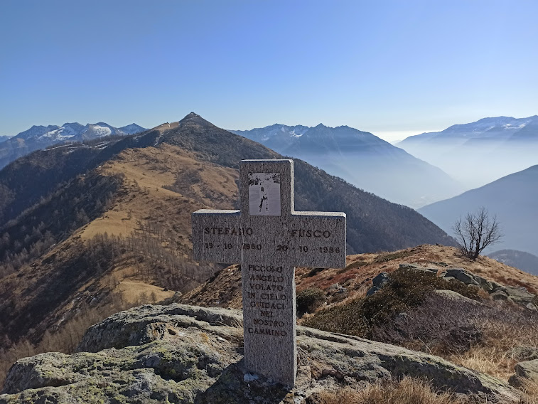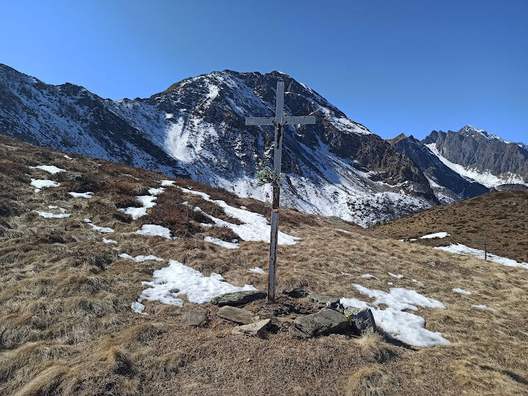 Torniamo sullo spartiacque fra Antrona e Bognanco in corrispondenza della croce che ricorda il giovane Stefano, piccolo angelo volato in cielo venticinque anni fa. Più in alto lasciamo alla nostra sinistra il sentiero C06, diretto alla Cima Camughera, e, in direzione nord ovest, nuovamente sul versante della Val Bognanco, percorriamo il sentiero più evidente, in parte ancora innevato, che ci porta a Croce Saudera.