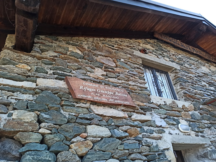 Qui si comincia ad entrare nel bosco di faggi, le cui foglie scivolose e subdole consigliano di mantenere le ridotte inserite almeno fin dove il bosco diventa più fitto, più pulito e meno ripido. Dopo un’ora e un quarto siamo all’Alpe Manzano, 1293, dove si trova il Rifugio privato Giuseppe Bottini, grande, ben tenuto e gestito da un certo numero di soci, fra i quali la nostra guida di oggi.