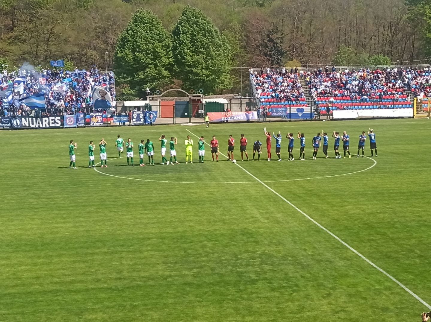 GOZZANO – 01-05-2022 -- Arriva sul Cusio la promozione matematica del Novara Fc in Serie C. Pur non riuscendo a conquistare i tre punti che sarebbero serviti allo scopo senza stare a guardare il risultato della Sanremese, gli azzurri hanno approfittato della rete di Parlanti del Sestri Levante al terzo minuto di recupero che ha costretto al pari i rivali del Novara nella corsa alla categoria superiore. Lo 0-0 maturato in un D’Albertas quasi completamente esaurito ed invaso da striscioni e bandiere degli ultras novaresi, non ha dunque impedito la festa finale. Veniamo alla cronaca. Si vede per primo il Gozzano, all’8° Bane ci prova di testa ma la difesa libera. Due minuti dopo una punizione di Cozzari termina a lato di parecchio. All’11° Pagliai serve Vuthaj in area cusiana, Vagge si salva in corner. Al 15° l’angolo è per il Gozzano ma Cozzari di testa mette a lato. Al 20° è Costanzo a mettere in mezzo e la difesa del Novara a salvarsi in corner. Al 28° Cozzari serve Montesano che si vede ribattere la conclusione. Il Novara si fa vedere a sua volta in varie occasioni in area rossoblù, ma senza costruire nulla di pericoloso. Al 30° la palla gol del Gozzano: Castelletto smarca Pennati a due metri dalla linea di porta con Desjardins battuto, ma l’attaccante controlla male e spara alto sulla traversa. Due minuti e Gonzalez al volo appena fuori area calcia verso la porta, ne esce solo un corner. Un altro minuto ed è Vuthaj a mettere fuori di testa da due passi. La vera occasione per il Novara è al 35°: Vaccari lancia in velocità Gonzalez che entra in area e batte quasi a colpo sicuro, ma Vagge si supera e ci arriva di piede. Si passa al secondo tempo. Al 51° Vuthaj calcia dal limite e colpisce l’incrocio dei pali. Al 54° Castelletto di testa, para facilmente Desjardins che si ripete due minuti dopo su una conclusione di Costanzo. Non succede più nulla di significativo fino al 76° quando il Novara inizia a premere con decisione stimolato dalle notizie che danno la Sanremese in vantaggio 2-1 col Sestri Levante. Calcia ancora Vuthaj da un metro ma Montesano salva sulla linea spedendo in corner. Ci prova Tentoni al 79°, servito da Laaribi, ma il tiro è debole. L’ultima occasione all’inizio del recupero è del Gozzano: Cozzari viene atterrato al limite da Benassi, punizione di Montesano che impegna Desjardins costringendolo alla deviazione in angolo. Al triplice fischio dell’arbitro, signor Rispoli di Locri che ha molto ben diretto, le squadre rientrano negli spogliatoi, ma nemmeno due minuti dopo arriva la notizia delle rete di Parlanti a Sanremo e tutto il Novara si riversa nuovamente in campo e inizia la festa delle centinaia di sostenitori che gremivano le gradinate. (FAB)
