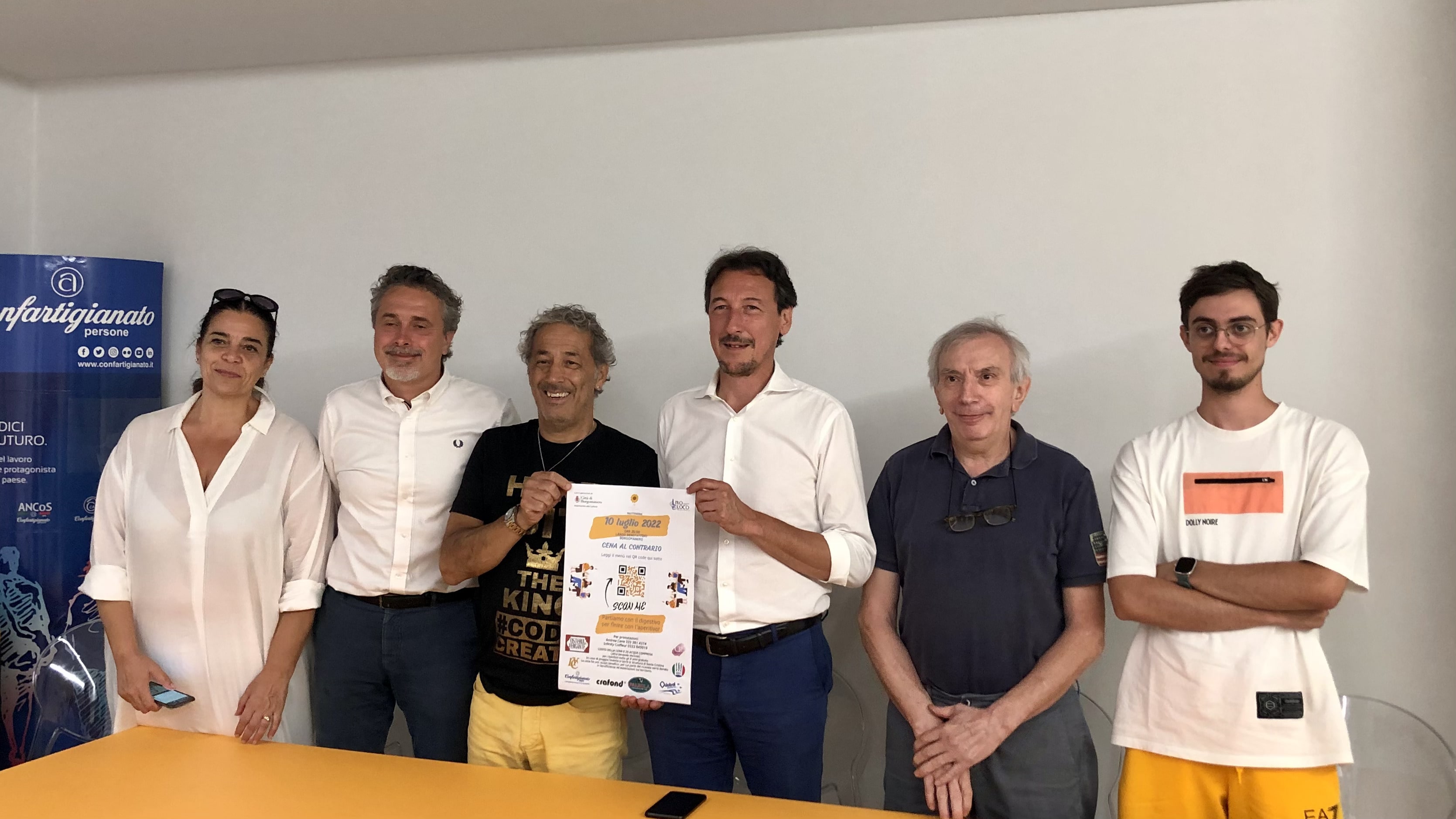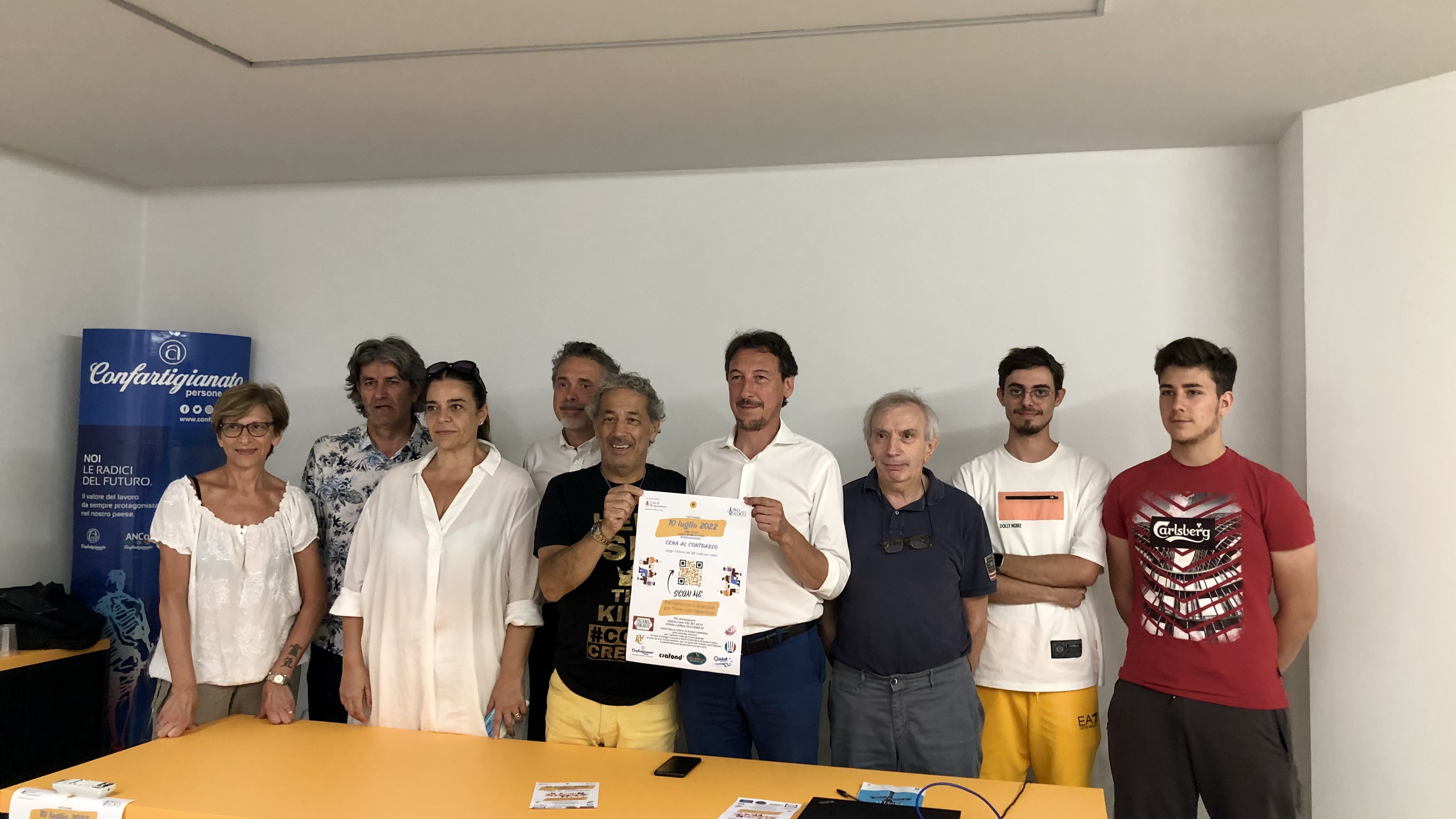 BORGOMANERO – 05-07-2022 – È stata presentata nel pomeriggio di lunedì 4 luglio 2022, la terza edizione della “Cena al contrario”, promossa dall’Associazione Nove Settembre, con la collaborazione di Pro Loco Borgomanero e il patrocinio del Comune di Borgomanero. Presenti Cinzia Rognoni di Gazza Ladra Invorio, Giovanni Torraco di Infinity Coiffeur, Andrea Favergiotti responsabile di Confartigianato Borgomanero e Valsesia, il presidente dell’Associazione Cuochi Andrea Cane, l’assessore alla cultura Francesco Valsesia, il presidente e il vicepresidente di Pro Loco Borgomanero, Davide Cerutti e Simone Sabatino.