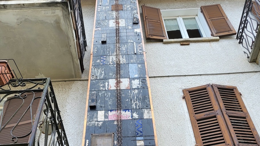 ORTA SAN GIULIO - 15-07-2022 -- Con l’intervento di due squadre di Vigili del Fuoco di Borgomanero e Romagnano Sesia sono state rimosse a Legro -piccola frazione di Orta San Giulio famosa per i suoi muri dipinti- le porzioni pericolanti dell’alta installazione firmata da Barbara Biscuola e realizzata con un collage di arte povera utilizzando legno, pietra, ferro e beola sulla canna fumaria di un locale in piazza della stazione.