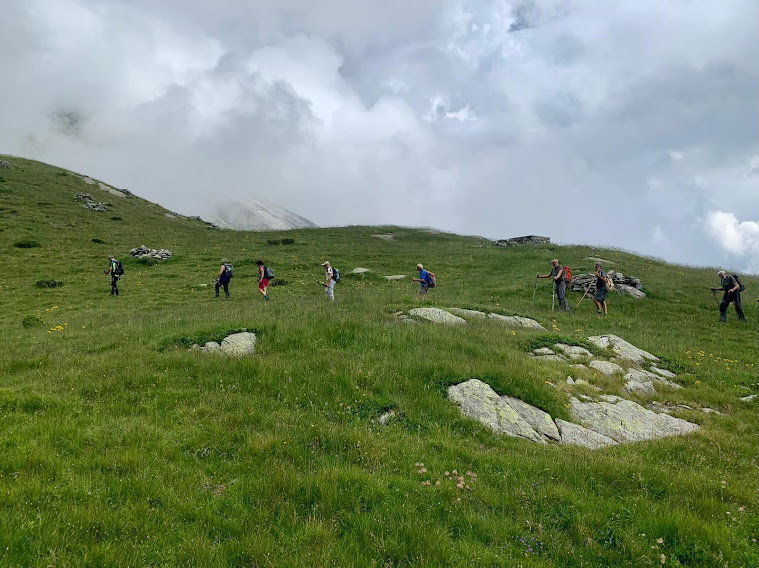 Dopo un’ora siamo nuovamente all’Alpe Ruggia, avendo perso quasi mezz’ora nel tentativo di salire verso il Pizzo. Si aprono gli ombrelli (chi li ha). Ripassiamo dal laghetto principale, con la sua minidiga artigianale, dal rifugio, dove i lavori sono sospesi per pioggia, ed eccoci di nuovo alla Bocchetta di Muino. Un breve sprazzo di sole ci induce ad allungare il ritorno alla Piana. Ne prendiamo la direzione in discesa fino al bivio per salire alla Cima Trubbio. Risaliamo, ma teniamo la destra e raggiungiamo una modesta altura, 1879, che domina La Piana a occidente e la Colma di Craveggia a oriente.