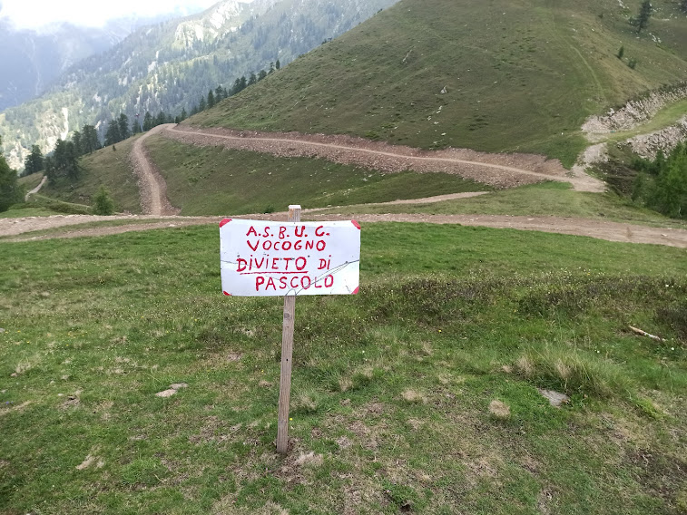 Qui incontriamo anche la strada le cui vicende seguo da anni e che sale da Craveggia alla Colma, proseguendo fino a qui per poi scendere alla Piana. La quale Piana sta per essere raggiunta, o lo è già, anche da una strada che sale da Toceno. Insomma, un nodo di traffico veramente strategico! Dove verrà piazzato il Telepass? Troviamo anche un cartello di “divieto di pascolo”.