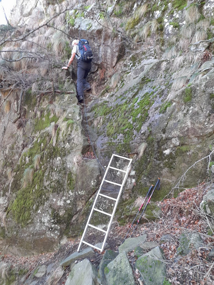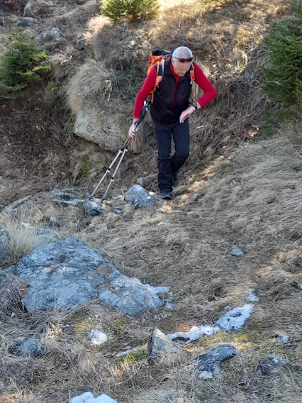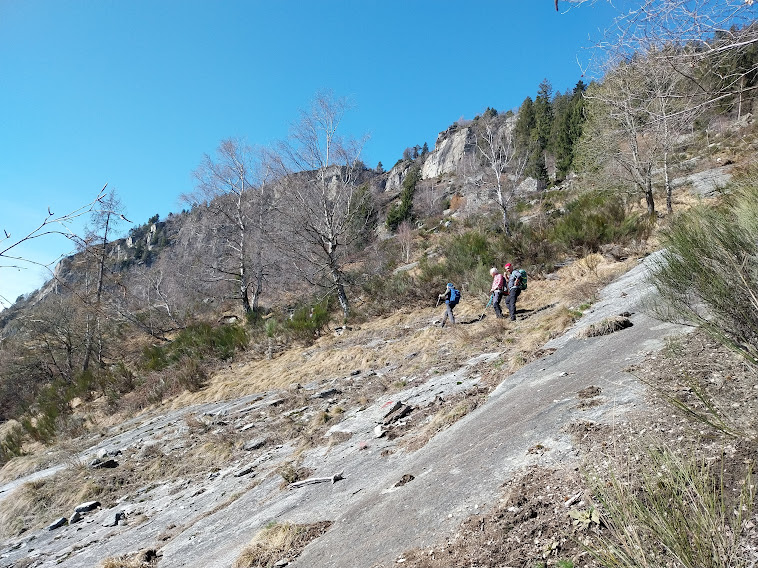 Le indicazioni, a seconda della “fonte”, vanno da sentiero evidente a sentiero inesistente e da facile a difficile. Posso solo dire che non è difficile, ma non è neppure ben segnato ed è, comunque , faticoso e difficilmente praticabile in estate. Viriamo gradualmente a sud ovest, ci abbassiamo leggermente e saliamo, su sentiero a tornanti stretti, un ripido canale, che ha sulla sinistra anche una variante quasi alpinistica, abbastanza artigianale, con scaletta “domestica” in partenza e cordine metalliche più in alto.