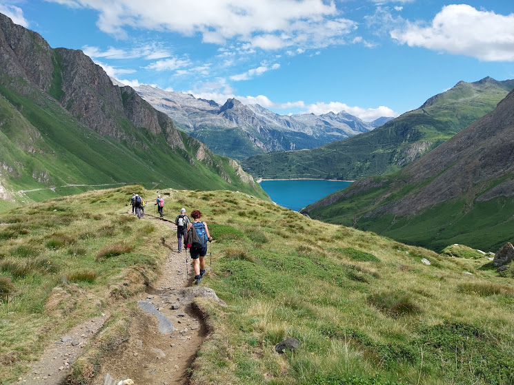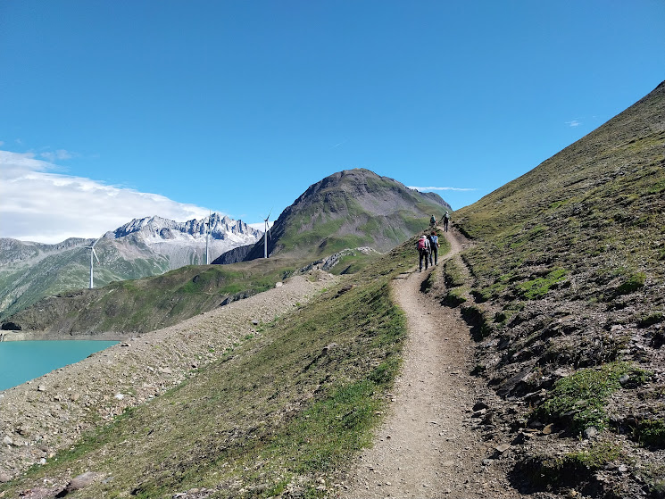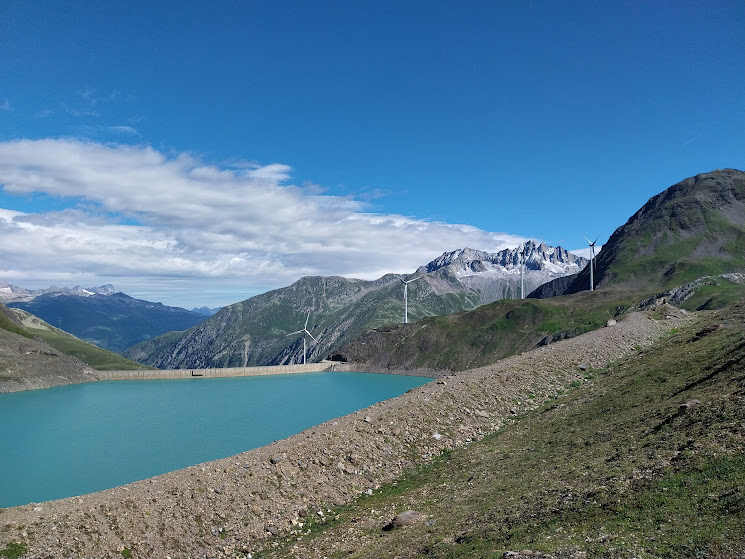 Oggi ci risparmieremo soltanto, rispetto al 2016, la visita alle quattro grandi centrali eoliche in prossimità del Griessee ed il relativo dislivello in più. Parcheggiamo a pagamento sotto la diga di Morasco, 1743. Sole, nuvole, un po’ di vento e quattro gradi, ideali per camminare, soprattutto nel noioso tratto di strada che fiancheggia il Lago e ci porta alla partenza della funivia ENEL, 1850 circa.