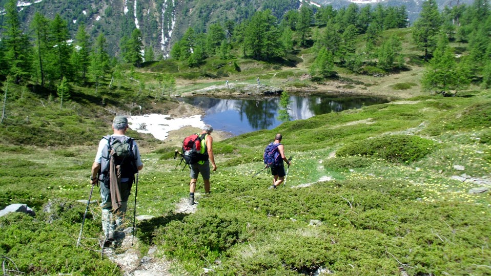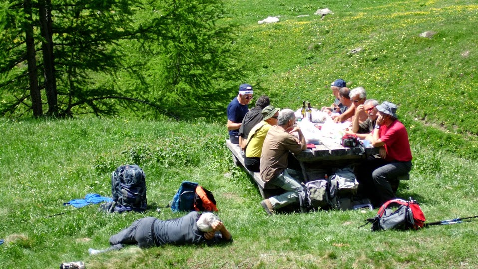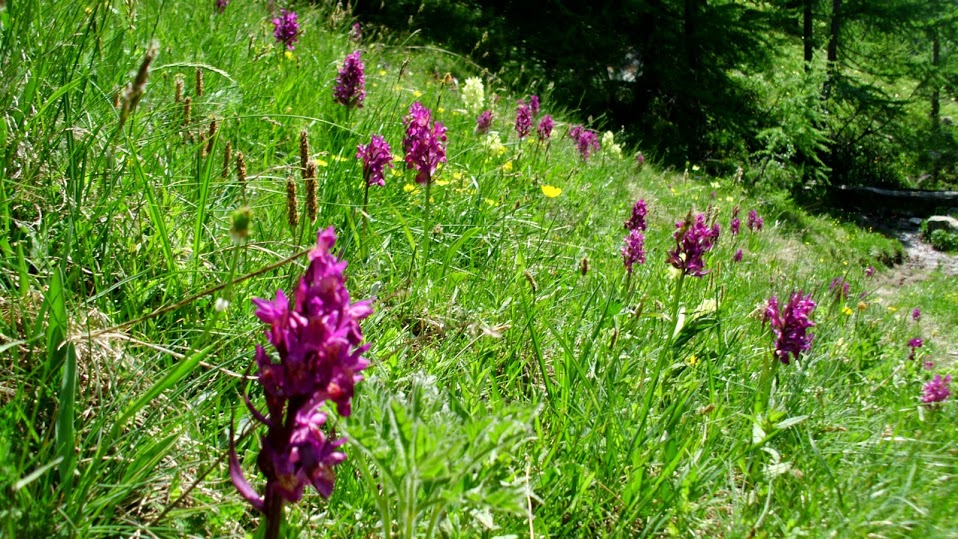 E' ancora in corso la splendida fioritura che, da sola, convalida le quasi sei ore di cammino odierne. Questi fiori sono belli soltanto in questi prati e nelle nostre fotografie. Raccoglierli per vederli sfioriti dopo poche ore è un delitto. Qui l'hanno capito. E chi non l’ha capito viene giustamente “stangato” in modo da non ripetere mai più l’errore. Da Furggu puntiamo a est, verso la Zwischbergental, fino a raggiungere in breve un'area attrezzata, con fontana, tavolo e panche. Dopo pranzo i cinque meno in forma, dei quali faccio parte dopo quasi due mesi di inattività, ritornano a Gabi e recuperano le auto. I sei inossidabili scendono verso la Zwischbergental, sempre su bel sentiero, giungendo in meno di un’ora al bacino di Sera, 1278.
