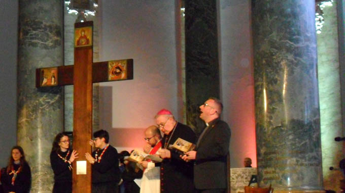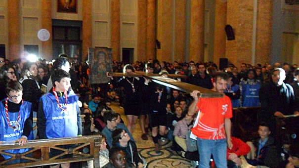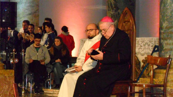 BOCA – 16-04-2019 -Centinaia di giovani da tutta la Diocesi di Novara al Santuario di Boca per la Veglia delle Palme. Le previsioni meteo avverse, hanno costretto gli organizzatori a trasferire la Veglia, inizialmente in programma nella città di Omegna, a Boca ma il cuore della proposta è rimasto lo stesso: un momento per i giovani della Diocesi di preghiera e riflessione guidato dal vescovo e dal direttore della pastorale giovanile don Marco Masoni. Monsignor Franco Giulio Brambilla li ha invitati a rispondere alla domanda “Come avverrà?”, che scaturisce dal tema della Giornata mondiale della gioventù 2019 “Ecco la serva del Signore; avvenga per me secondo la tua parola”, guardando alla nostra vita con “speranza viva” per essere “cercatori” di quella felicità che solo Dio può donarci. La veglia è stata preceduta nel pomeriggio da una tavola rotonda, moderata dal giornalista di Radiocor Il Sole 24 Ore Andrea Fontana, sul tema “Cercatori di felicità”, con ospiti il gesuita Emilio Zanetti e l’atleta paraolimpico Daniele Cassioli. Il Santuario di Boca ha accolto l’immagine della Madonna del sangue di Re, icona-simbolo del triennio di pastorale giovanile, portata dai ragazzi di Varallo Sesia, dove si era tenuta la Veglia 2018.