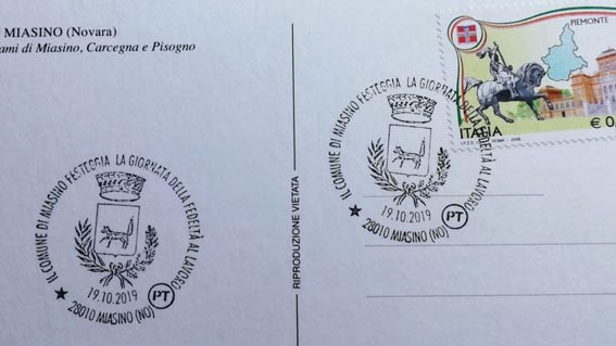 Durante la festa del 19 ottobre, c’è stato un annullo filatelico dedicato alla “Giornata alla fedeltà al lavoro a Miasino”, presente per l’occasione la sig.ra Fabiano Donata, referente filatelica di Poste Italiane per le province di Novara, Verbania e Biella.