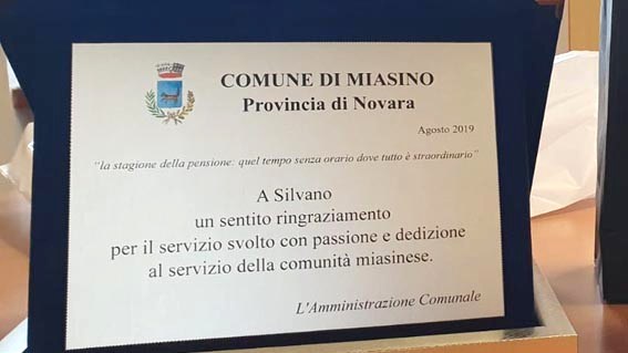 Nei giorni scorsi,proprio per festeggiare il suo pensionamento, a Miasino è stata organizzata una piccola cerimonia, un momento festoso che è stato chiara espressione di quel “grazie” che Miasino ha voluto esprimere al suo vigile.