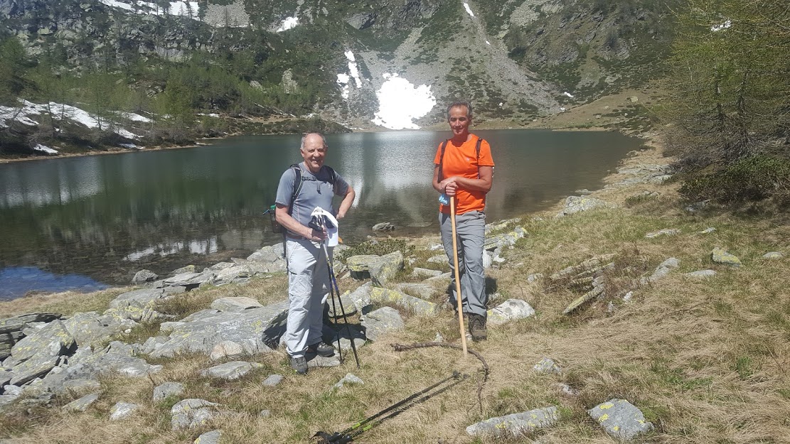 In una bella giornata di fine primavera tre anzianotti ed un giovane neopensionato si ritrovano a fondovalle e proseguono, con il lusso di due auto, verso Canei, frazione alta di Crevoladossola, sopra Preglia. Durante questo avvicinamento i due giovani tentano di raggiungere la stazione ferroviaria di Preglia, sperando vanamente di trovare un treno locale per l’Alpe Andromia. Da Canei si prosegue sulla strada ripida e tortuosa fino a Onzo e si parcheggia prima della sbarra che nega l’accesso ai cittadini di serie B, a quota 850 circa. Il sentiero ripido e ben segnato taglia spesso la strada. Camminiamo fortunatamente in ombra e, in meno di due ore, arriviamo alla bellissima spianata dell’Alpe Fuori, 1533. Una pausa tranquilla di foto e contemplazione. Gustiamo finalmente il ritorno con i nostri amici sulle nostre montagne: è una sensazione che “si respira” a pieni polmoni, Covid permettendo.