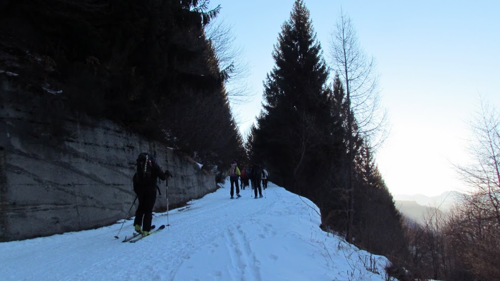 Partiamo nonostante previsioni incerte e il nostro coraggio sarà premiato da una bella giornata. C’è, comunque, troppa neve, anche recente, per pensare a itinerari presuntuosi. Anche il vento dei giorni scorsi ha contribuito a creare condizioni pericolose del manto nevoso quasi ovunque. Non volendo dare lavoro in più al Soccorso Alpino, già super impegnato di questi tempi, optiamo per una gita sicura, in ambiente bellissimo e con meta estremamente ospitale. Il Rifugio Pietro Crosta, all’alpe Solcio, ai piedi del maestoso gruppo Diei – Cistella, è stato rigenerato negli ultimi anni da Marina ed Enrico, due professionisti della montagna. Con le loro continue e belle iniziative, con la loro sempre squisita ospitalità e con il loro lavoro di preparazione e controllo dei vari itinerari d’accesso a Solcio hanno trasformato il rifugio in una delle mete più ambite, con qualsiasi tempo, per qualsiasi capacità ed in qualsiasi stagione. E’ sufficiente un minimo allenamento ed un po’ di dimestichezza con la neve, almeno in gennaio. Oggi cerchiamo di soddisfare tutti i componenti del nostro gruppo, cani compresi, ed organizziamo un’escursione mista per ciaspolatori, sci-alpinisti e border collie. Partiamo da Maulone, quota 950, lungo la strada Varzo – San Domenico. Troviamo anche il comodo posteggio sgomberato dalla neve. Qui inizia la strada, oggi ben innevata, che, in circa 9 km, conduce a Solcio. Acquisita conoscenza di nuove attrezzature, con le consuete difficoltà dovute all’età avanzata,, gli sci-alpinisti si lanciano all’inseguimento dei ciaspolatori, ma oggi nessuno ha fretta e ci si ricongiunge rapidamente. Seguiamo sempre la strada, perfettamente battuta fino a Solcio. La calma odierna è dovuta anche all’indisposizione di un anziano, che ci ha seguiti eroicamente anche oggi, con il permesso del suo geriatra, nonostante un’indisposizione che gli toglie miracolosamente, oltre alle energie, anche l’appetito. Passiamo Maulone Sopra (1052) e Ple (1111). Prima di Salera (1203) il border avvista due caprioli, ma la faccio (è una signorina!) subito desistere da un vano tentativo di far loro compagnia. Sarebbe come se il suo padrone tentasse di inseguire Damiano Lenzi in salita. A Salera, dopo un’ora di marcia, ci concediamo la solita dolce colazione. Seguono La Pree (1297), Calantiggine (1439 – quasi due ore da Maulone), Astolo (1581) e Solcio (1750), dove arriviamo dopo tre ore di cammino facile e tranquillo. E’ presto e siamo costretti ad un lungo aperitivo, prima di gustare l’ottima cucina di Marina. L’anziano influenzato mangia molto meno del solito e questo conferma la gravità del suo stato di salute, ma siamo sicuri che sopravvivrà anche oggi. A digestione quasi completata, noi sciatori salutiamo gli amici e ci avviamo verso valle con l’indispensabile prudenza da adottare dopo pranzo, raggiungendo Maulone in tre quarti d’ora.