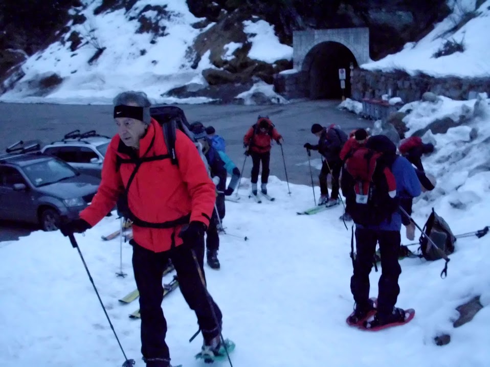 La seconda uscita del 2013 ci regala una giornata grigia, ovviamente fredda (siamo in gennaio e non c'è sole!), adatta ad un percorso relativamente breve, che ci consenta di rifocillarci al caldo. Non sono ammessi fra noi i superstiziosi, perché oggi siamo in tredici, otto con ciaspole e cinque con sci. Si parcheggia dopo la casetta degli esattori dell'anacronistico pedaggio per Devero, mascherato da quota per il parcheggio, che spesso è completamente occupato. Siamo nel piazzale all'imbocco della seconda galleria, quota 1500 circa. Subito ciaspole e sci ai piedi ed in venti minuti si raggiunge l'alpe Cologno, 1684. La neve è gelata e fanno comodo i rampant.