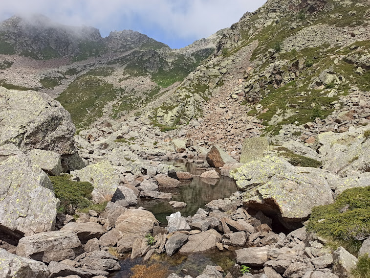 Qui un’indicazione sarebbe indispensabile, ma non c’è. In più è l’unico momento della giornata in cui le nuvole basse prevalgono e la visibilità scarseggia. La cartina, a dire il vero, dà l’indicazione corretta, che sarebbe quella di seguire la traccia di sinistra, sud est, e scendere verso il Monte del Dente a incontrare il sentiero D14 ch sale dalla Gomba al Lago di Oriaccia, ben segnato. Noi scegliamo una scomoda scorciatoia, salendo di qualche decina di metri a nord ovest, destra, e scollinando su una vasta e ripida pietraia, dove scendiamo di oltre un centinaio di metri verso occidente con percorso libero. Incrociamo il sentiero D14 e saliamo in breve al Lago di Oriaccia, 2128. A parte le brevissime pause, ci accorgiamo di averci impiegato quasi tre ore, alla faccia del cartello a San Bernardo. Tutto bello: a nord ci domina il Verosso, a sud ovest si potrebbe proseguire per l’Alpe Laghetto, ma il percorso si allungherebbe troppo.