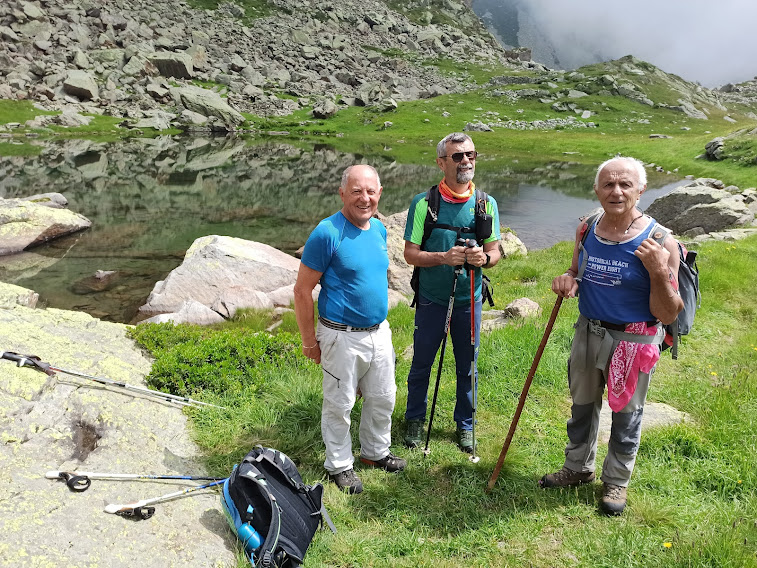Ci troviamo al Ponte di Mocogna e questa volta il meteorologo ufficiale conferma la destinazione “Alta Val Bognanco” e la modalità “ombrelli in auto”. Qualche nuvola vagante non ci creerà problemi, se non sulla Costa del Dente, quando un momento di scarsa visibilità favorirà il nostro errore. Quattro anziani, con un adeguato staff medico, salgono in auto al grande parcheggio di San Bernardo, 1630. Oggi, ahimè, mancano le signore e non è la prima volta (altro “ahimè”) che mi trovo ad essere il più anziano del gruppo. Devo cominciare a preoccuparmi?