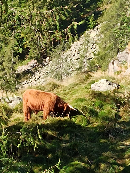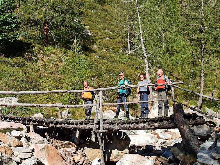 Molto simili, ma di provenienza diversa, sono le mucche Highlander scozzesi che abbiamo incontrato in Valle Vigezzo e in Valle Isorno negli anni scorsi. Usciamo dal bosco ed attraversiamo su un ponticello di legno il Rio Lasino, passando sulla destra orografica. L’ultimo strappo lungo il sentiero sempre evidente ci porta all’Alpe Asinello, 1831, in poco meno di un’ora. I forti del gruppo, cioè gli altri cinque, proseguirebbero volentieri, ma si lasciano contagiare dalla mia pigrizia e ci crogioliamo al sole di questa giornata ancora estiva.