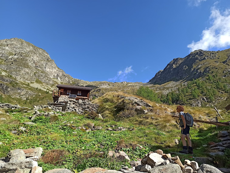 Qui si può salire verso nord al bivacco Lamè, ai Laghi Sfondati e al Pizzo San Martino e, verso nord ovest, all’Alpe Crosa, al Lago Grande, ai Laghi di Prebianca e al Passo di Lareccio. Tutte bellissime mete, ma, a parte l’Alpe Crosa e il Lago Grande, ancora piuttosto lontane. Dopo il pranzo molto più lungo del solito torniamo verso valle. All’Alpe Briga incontriamo altri yak, che ci vengono incontro, forse alla ricerca di sale, con due vitellini neri.