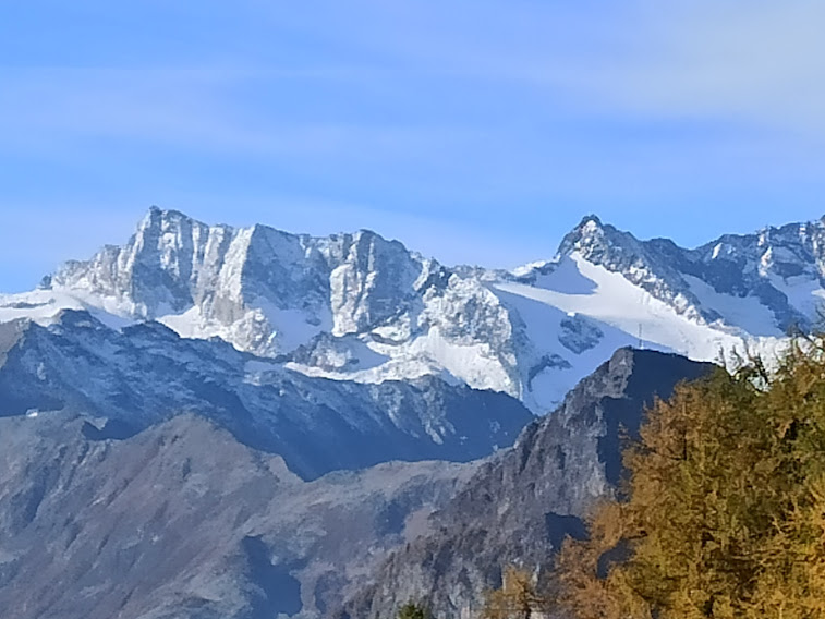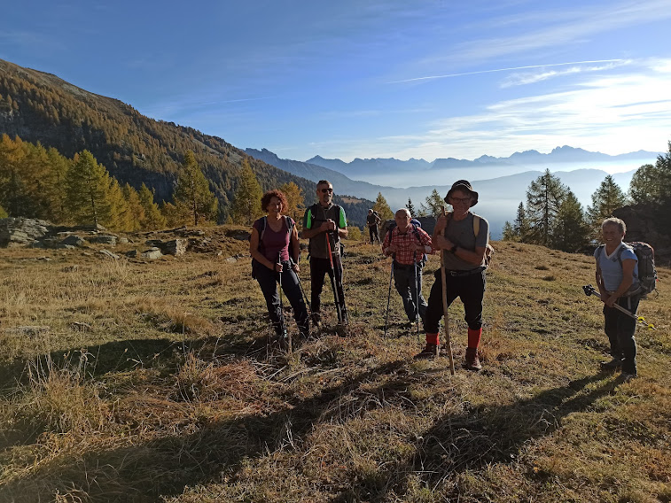 Una volta gli alpeggi erano molto più vivi di adesso e le strade non c’erano. O mi confondo? La pista sale in direzione dell’Alpe Lavazza, ma sicuramente non si fermerà lì: finché c’è salita c’è speranza! Torniamo ad immergerci nei colori dell’autunno lungo il sentiero evidente e piuttosto ripido, ad alto rendimento. Cominciano a farsi vedere l’Andolla, il Fletschorn, i quattromila del Sempione, lo smog a fondovalle. E per tutto il giorno attraverseremo boschi di larici spettacolari. Passiamo dall’Alpe Casalavera, 1549, e dall’Alpe Orzalina, 1696.