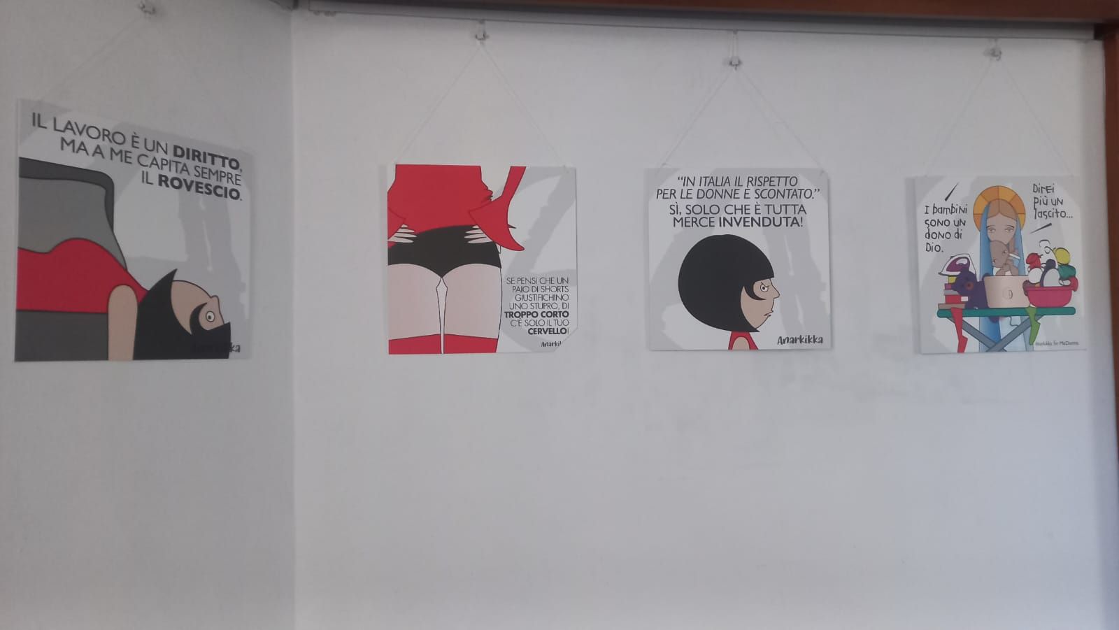 La mostra approfondisce il tema della violenza e del linguaggio che usiamo nel raccontarla. Linguaggio che si fa complice perché veicola e rafforza una narrazione sbagliata della sopraffazione, che abbiamo tutti interiorizzato. Per cui gelosia è attenzione, possesso è amore, delitto è raptus, inteso come risposta “passionale” alla disperazione, al tormento. Un linguaggio assolutorio, che nell’assolvere il criminale minimizza il crimine, nel relegare alla follia individuale deresponsabilizza una comunità che non fa i conti con la propria identità e valori, con il proprio sistema di significati. Assolve l’uomo e getta ombre sulla donna, sulla vittima, che diventa l’istigatrice del gesto folle, la responsabile, quella che “se l’è (sempre) cercata”. Quella, che ancora una volta, ha “la colpa” del suo stesso esistere. Una raccolta di vignette pubblicate negli anni che tenta di offrire un percorso che aiuti a ri-conoscere le disparità e le differenze.