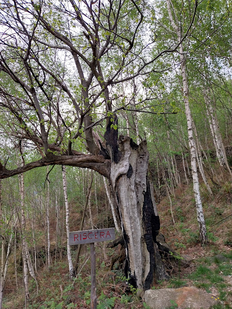 O meglio, questo sarebbe il programma. In effetti il bel sentiero è molto diretto, ripido, con qualche comoda ringhiera e cordina che aiutano l’anziano viandante. Dopo poco più di un’ora da Anzola siamo a Pian Sola, 650, dove viene raccontata la leggenda del Pidèn, l'enorme essere magico che aiutò Dio a completare il mondo e che, cadendo dall'alto, lasciò su uno di questi massi l'impronta del suo sederone. Qui termina la Stra’ Dricia e, fino a pochi anni fa, terminava anche la strada carrozzabile che adesso prosegue fino a Piazza Grande. I criteri costruttivi ormai sono quelli “moderni”, anche se il legname è raccolto e ordinato, mentre il sentiero A33, per ora, è “massacrato” solo in un breve tratto, dove incrocia la strada che, evidentemente, non è ancora ultimata.