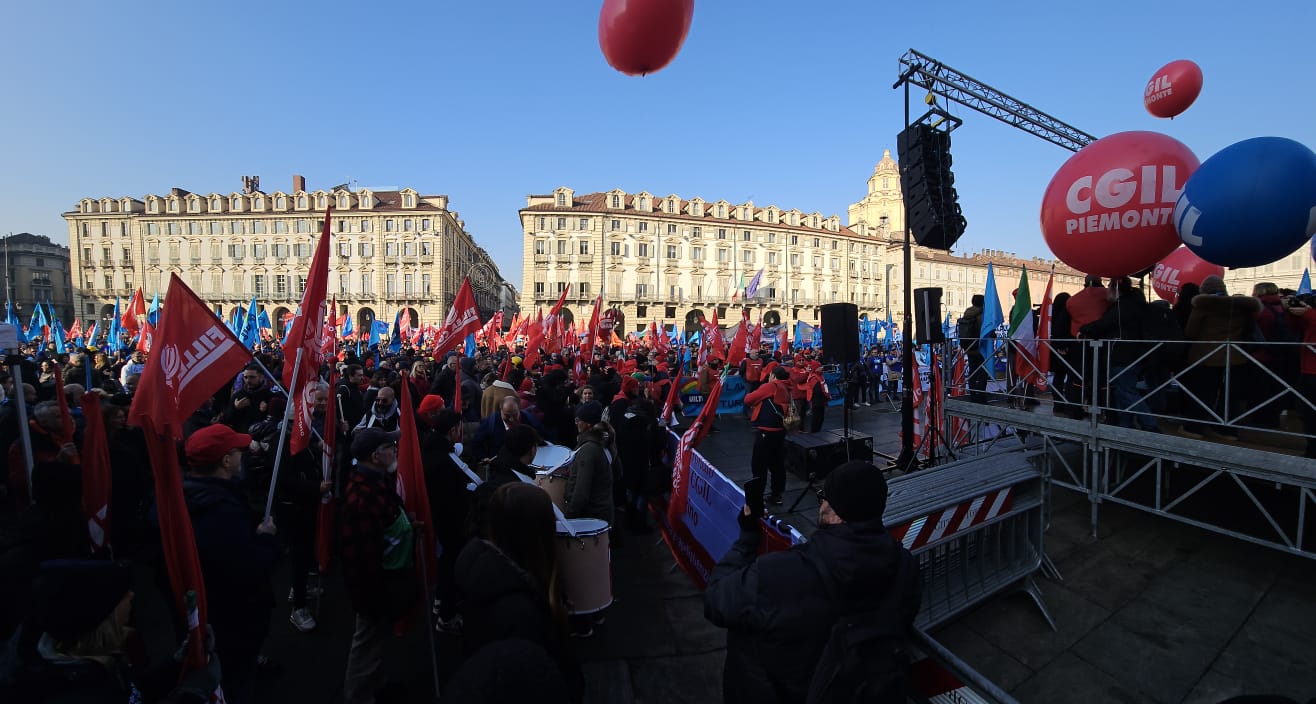 TORINO - 29-11-2024 -- A Torino è in corso la manifestazione di Cgil e Uil proclamata in occasione dello sciopero generale contro la politica economica del Governo. Ad una prima stima degli stessi sindacati sarebbe altissima l'adesione del manifatturiero (Lagostina 80%), alta nell'edilizia, manca ancora il dato del terziario mentre dal settore pubblico si parla di segnali incoraggianti a Novara ad esempio, è al 100% l'adesione al centro prelievi dell'ospedale. Come partecipazione alla manifestazione fonti sindacali parlano di 20mila presenze, oltre 600 da VCO e Novarese. I deti definiti nelle prossime ore.