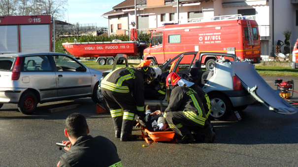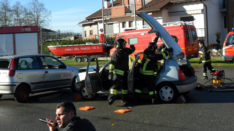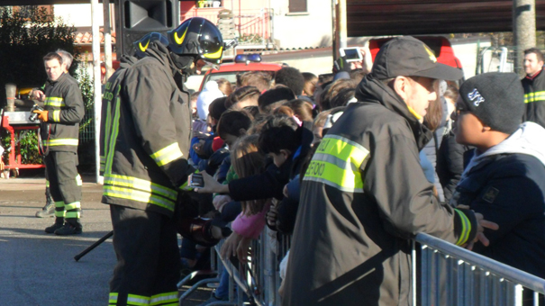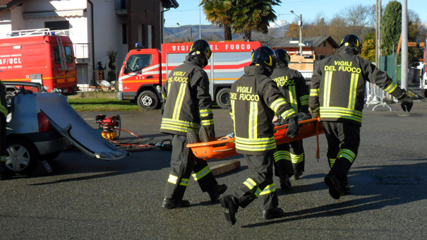 BORGOMANERO - 05-12-2018 - Scontro frontale tra due auto, un ferito incastrato tra le lamiere e i vigili del fuoco che intervengono per liberarlo. Non è il resoconto di un incidente reale, bensì un'esercitazione compiuta dai pompieri del distaccamento di Borgomanero, in occasione dei festeggiamenti per Santa Barbara, la loro patrona, e alla quale hanno partecipato quattro classi delle scuole primarie dell'Istituto comprensivo Borgomanero 2. I bambini hanno seguito con molto interesse le varie fasi dell'esercitazione, che hanno portato i vigili del fuoco a scoperchiare il tetto dell'automobile per liberare il ferito. Ad accogliere gli alunni è stato il capo distaccamento Roberto Forcetto e in seguito sono arrivati anche il sindaco di Borgomanero Sergio Bossi e l'assessore Franco Cerutti a portare il saluto dell'amministrazione comunale.